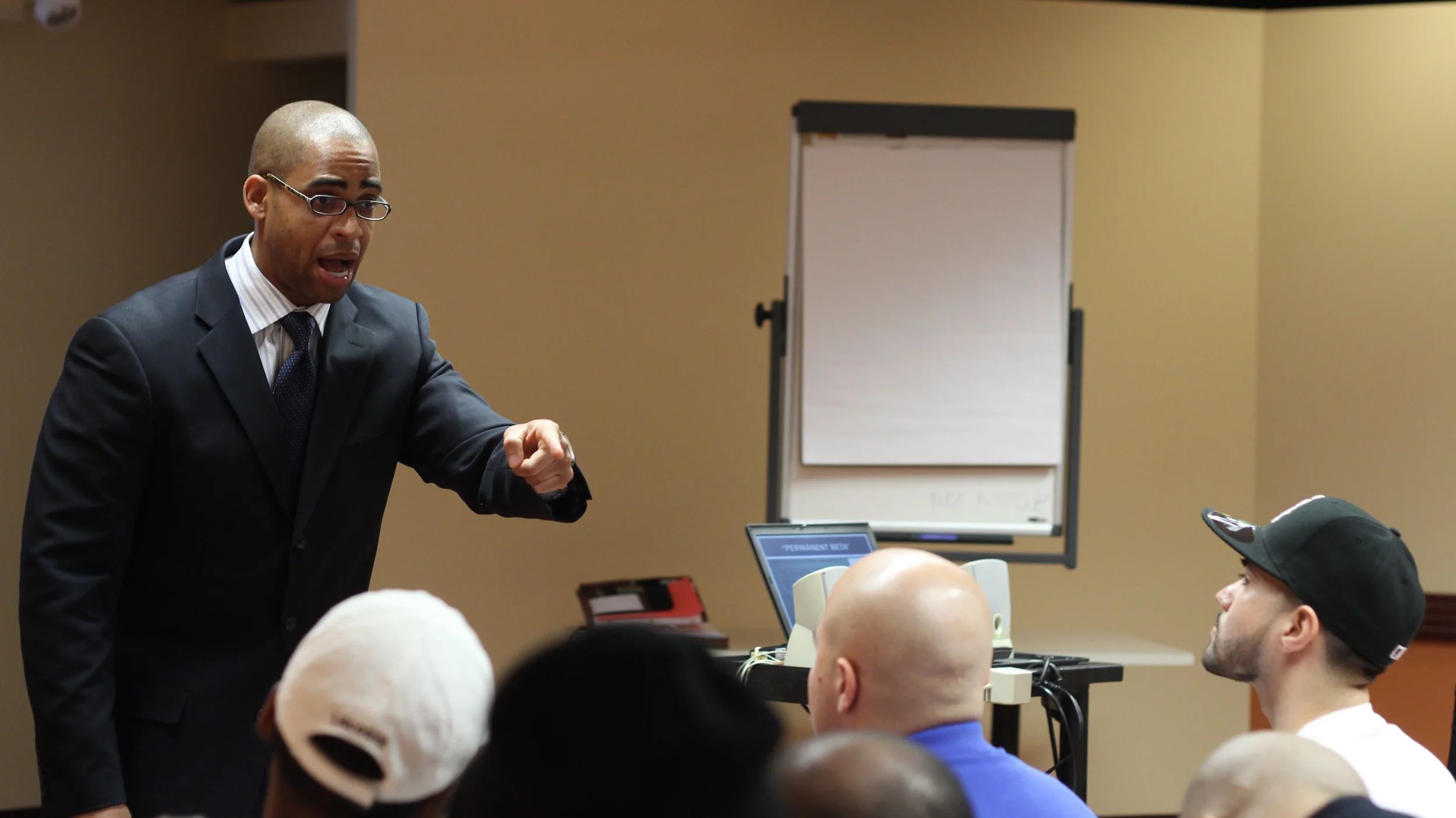 A man in a business suit with glasses is speaking passionately in front of a group of people, who are seated and listening.